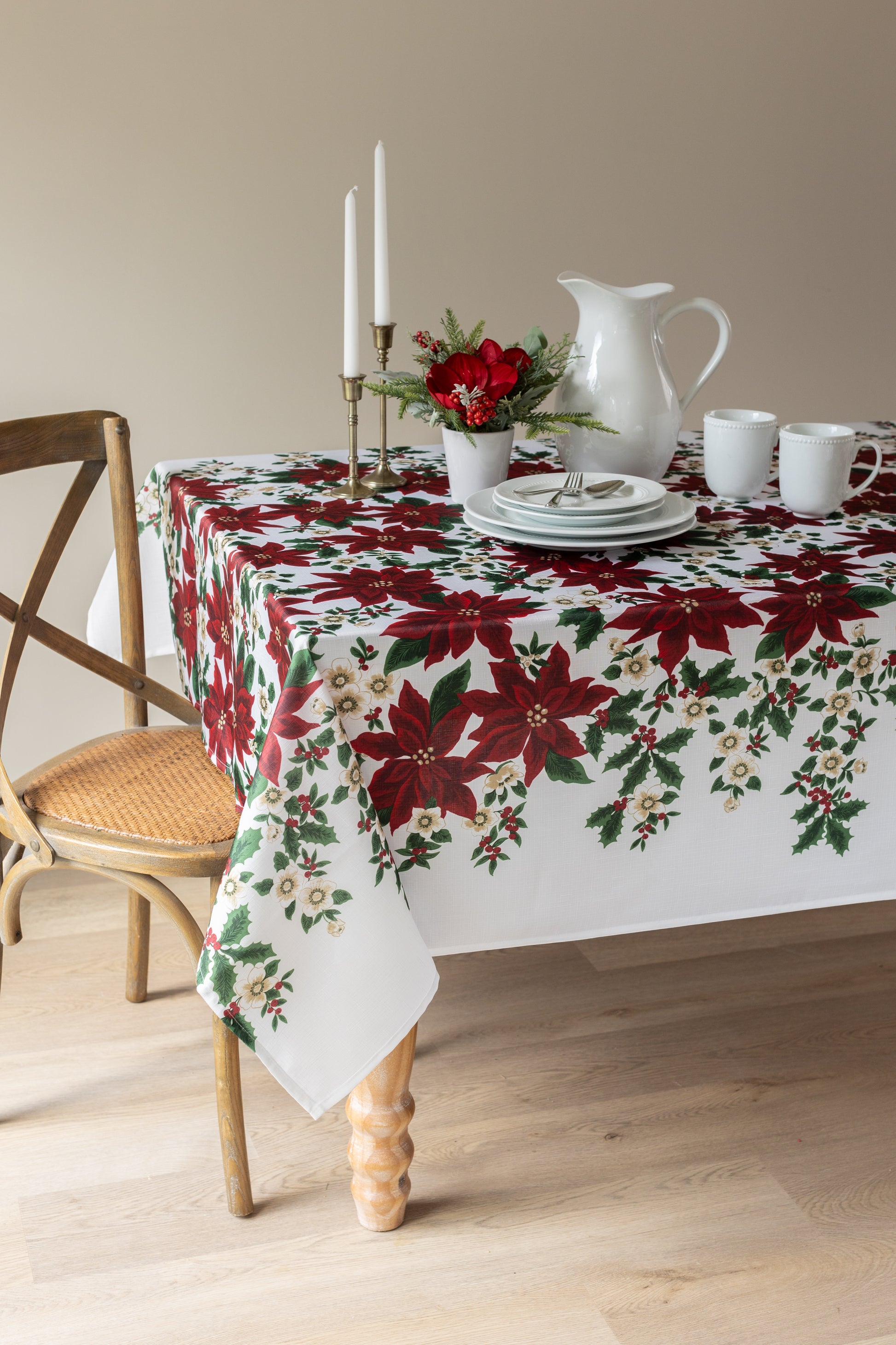 Transforma tu mesa con el mantel Blooming Poinsettia de Benson Mills, una pieza elegante y funcional diseñada para realzar tus celebraciones navideñas. Hecho con una mezcla de 52% algodón y 48% poliéster, este mantel de alta calidad combina estilo y durabilidad para crear un ambiente festivo inolvidable.