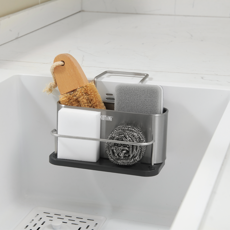 Cuenta con 3 compartimentos ideales para organizar esponjas, jabones, cepillos y fibras metálicas. Su barra frontal de acero inoxidable permite apoyar elementos húmedos, mientras que su estructura trasera ajustable se engancha al borde del lavadero, manteniéndolo firme y elevado.