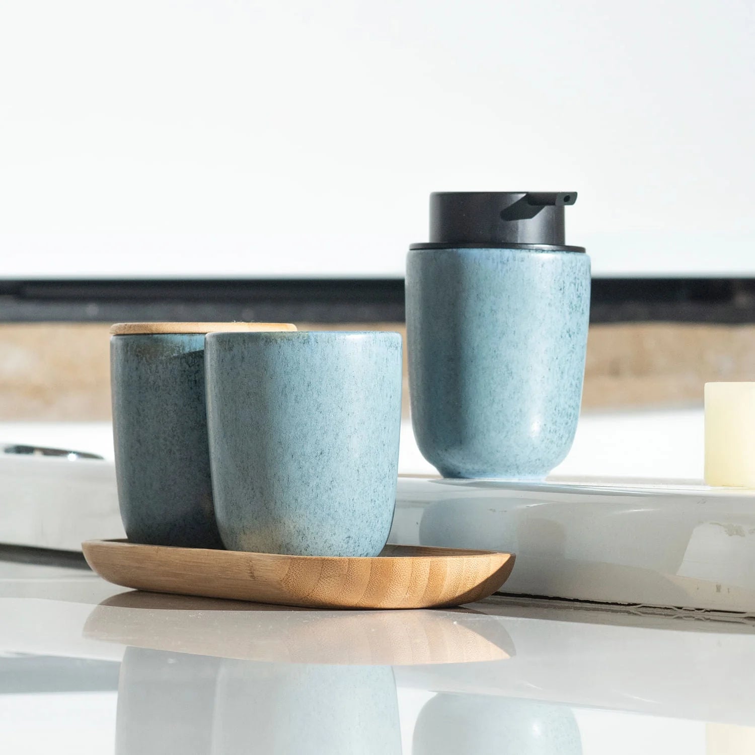 Diseñado para quienes valoran la estética, la funcionalidad y la sostenibilidad, este set combina cerámica texturizada con detalles en bambú 100% renovable.